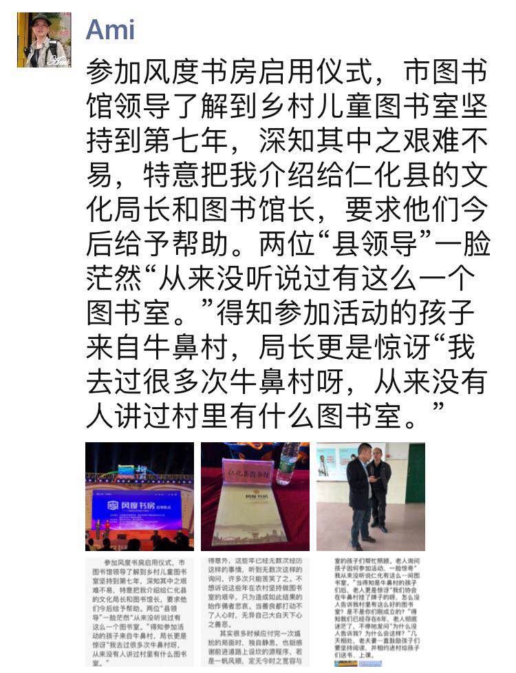 参加风度书房启用仪式,市图书馆领导了解到乡村儿童图书室坚持到第七年,深知其中之艰难不易,特意把我介绍给仁化县的文化局长和图书馆长,要求他们今后给予帮助。两位“县领导”一脸茫然“从来没听说过有这么一个图书室。”得知参加活动的孩子来自牛鼻村,局长更是惊讶“我去过很多次牛鼻村呀,从来没有人讲过村里有什么图书室。” 面对如此局面,我丝毫不觉得意外,这些年已经无数次经历这样的事情,听到无数次这样的询问。